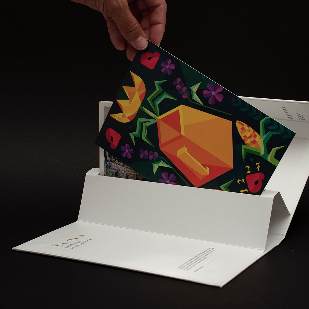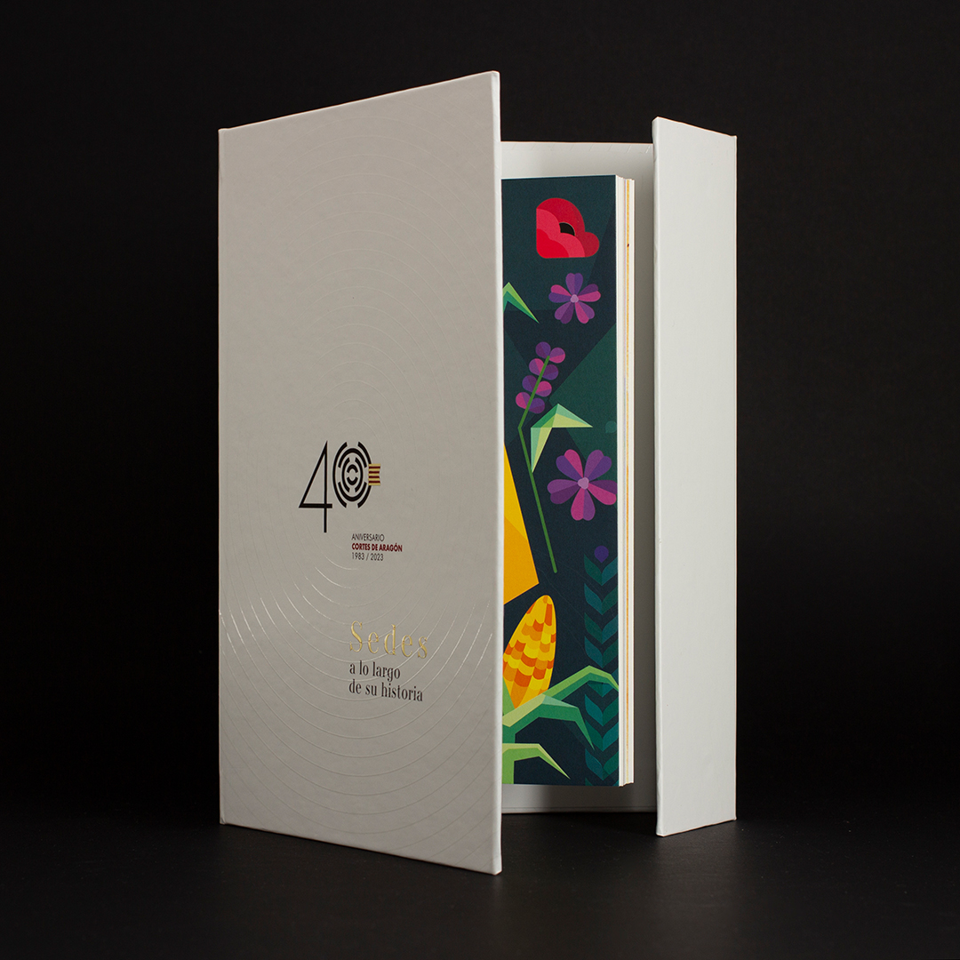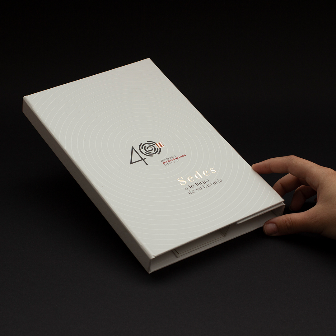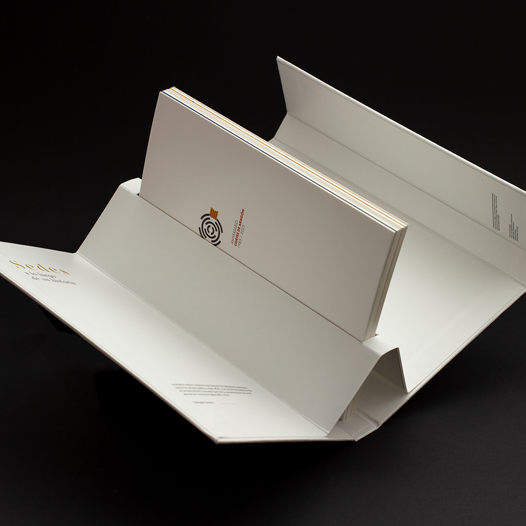 Desarrollamos un estuche pop-up donde el concepto y objetivo era crear un «volumen arquitectónico» para mostrás las láminas, haciendo así un guiño a las diferentes sedes de las Cortes.