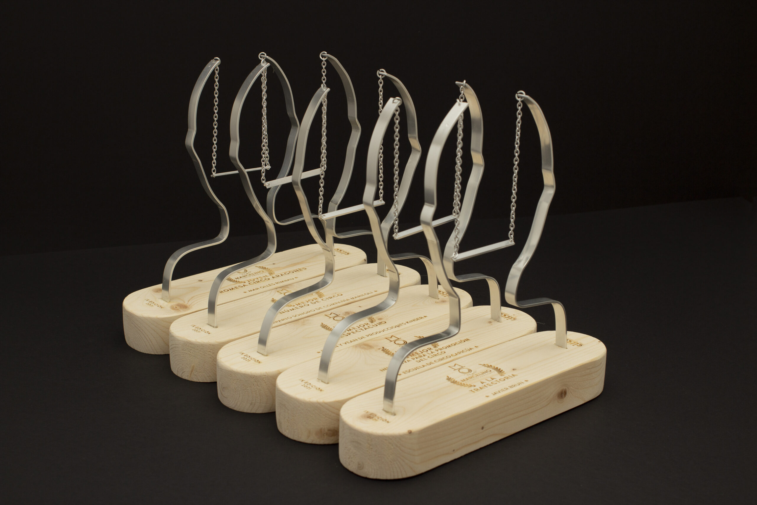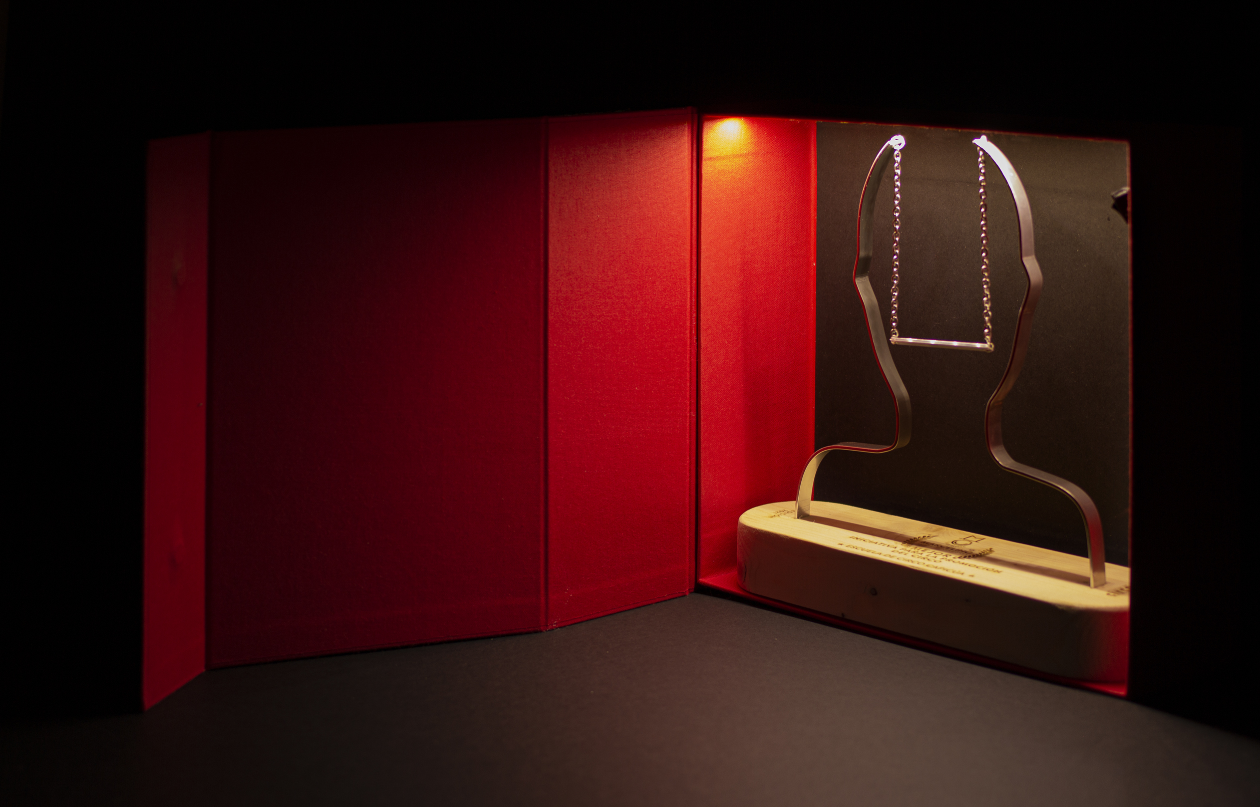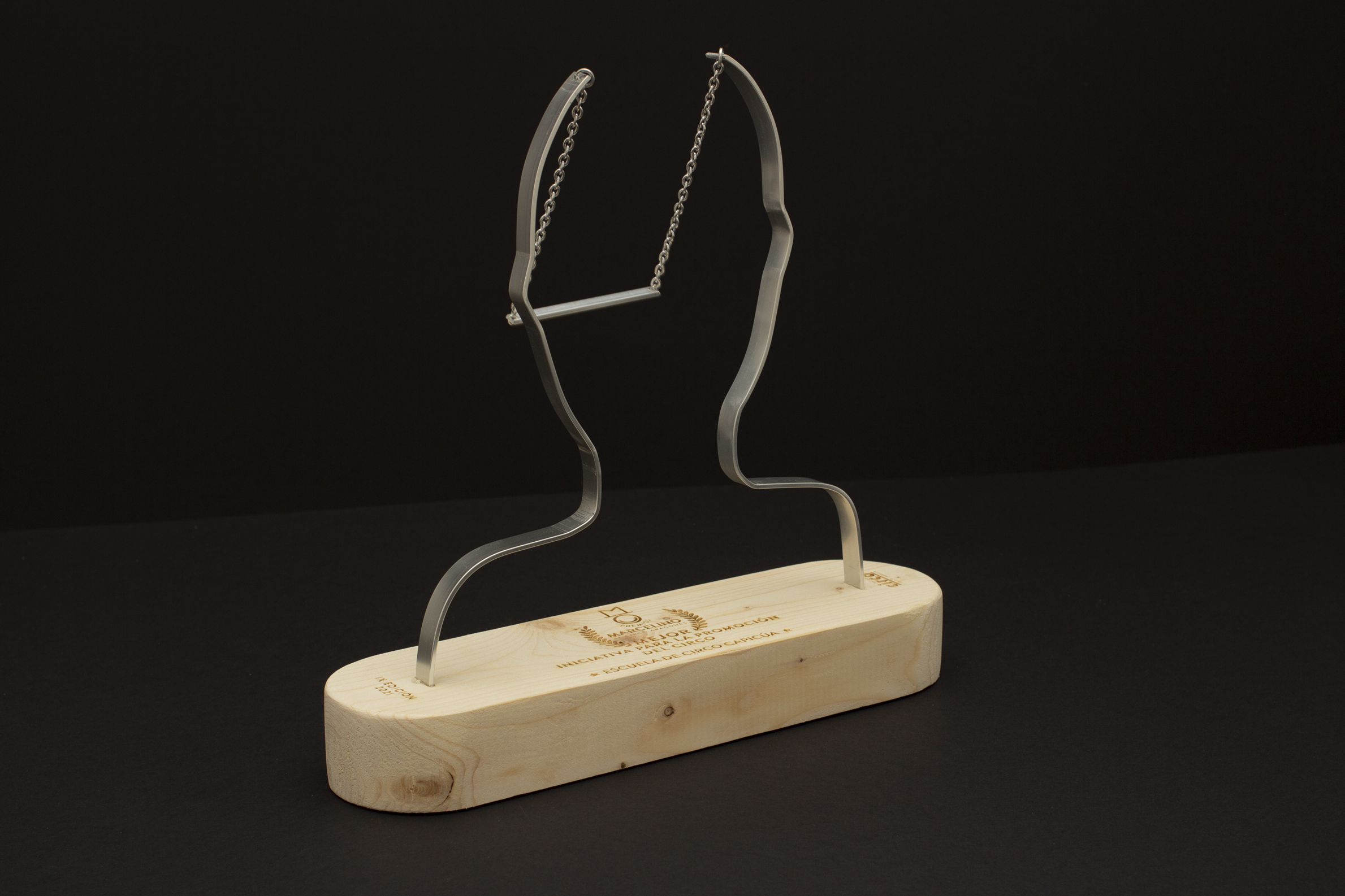 Realizados en madera y aluminio, las formas representan una sonrisa acrobática, a modo de trapecio, que va y viene, pero que siempre está ahí. La caja contenedora está articulada para que al abrirla, la tapa se quede recogida. Además la caja abierta se convierte en un escenario con su propia iluminación.