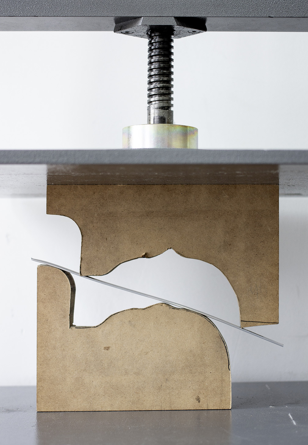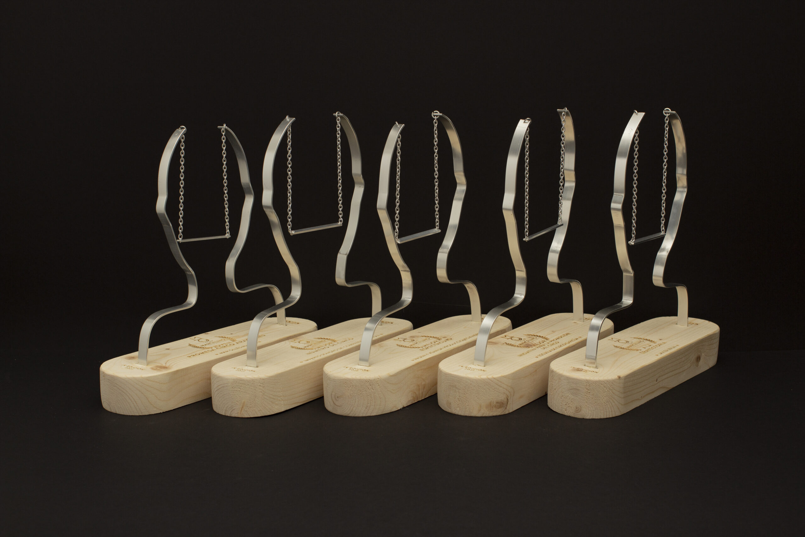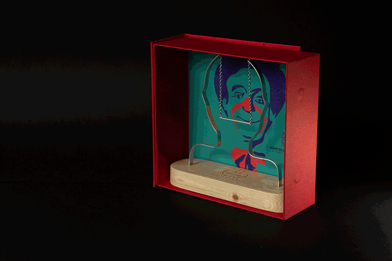 Realizados en madera y aluminio, las formas representan una sonrisa acrobática, a modo de trapecio, que va y viene, pero que siempre está ahí. La caja contenedora está articulada para que al abrirla, la tapa se quede recogida. Además la caja abierta se convierte en un escenario con su propia iluminación.